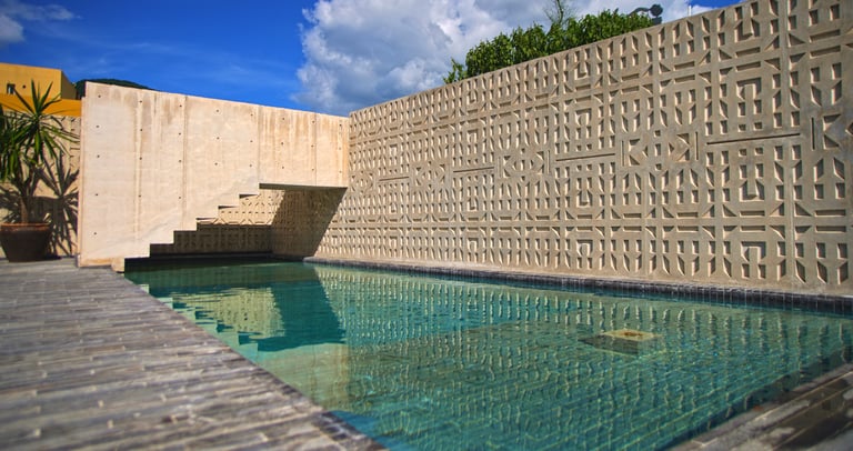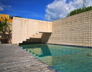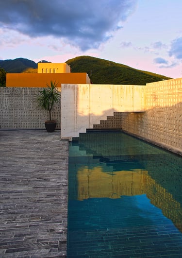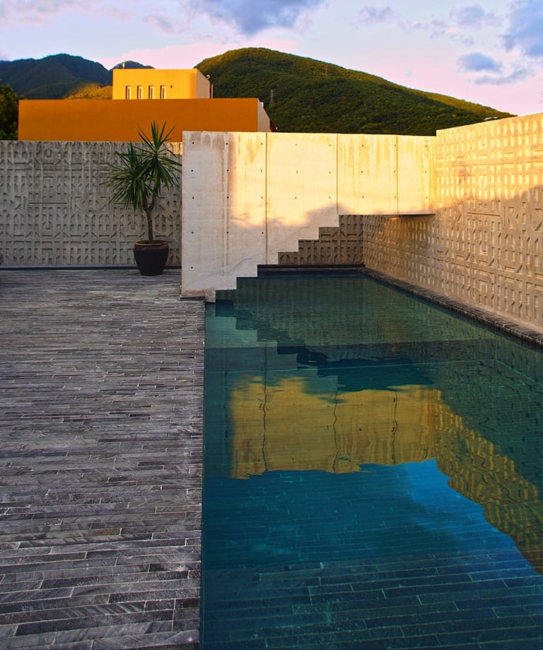 La alberca de CasaBlanca fue pensada en el clima de San Felipe del Agua, para quienes buscan un alojamiento en Oaxaca que combine arquitectura contemporánea con confort real. Su forma rectangular, el acabado en piedra volcánica y la temperatura templada del agua crean un ambiente ideal para relajarse después de explorar la ciudad. El espacio está rodeado por muros blancos y vegetación local, con privacidad y silencio en todo momento.
