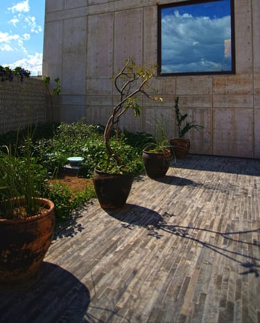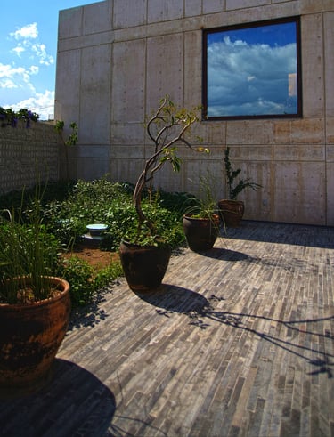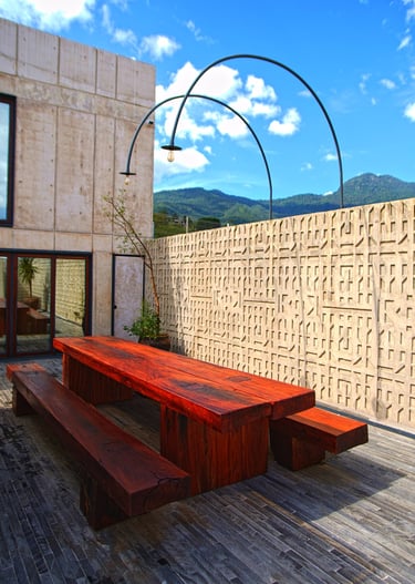 La terraza de CasaBlanca crea un espacio amplio y cómodo, pensado para compartir comidas o reuniones bajo el clima templado del norte de Oaxaca de Juárez. La mesa de madera de eucalipto para 12 personas, junto al jardín con plantas y flores locales, crea un ambiente acogedor y funcional para grupos y familias. Es el punto ideal para disfrutar una tarde tranquila o una cena al aire libre dentro de un alojamiento con espacios abiertos en Oaxaca.