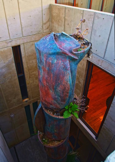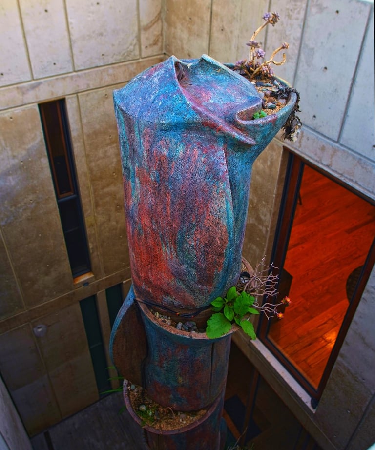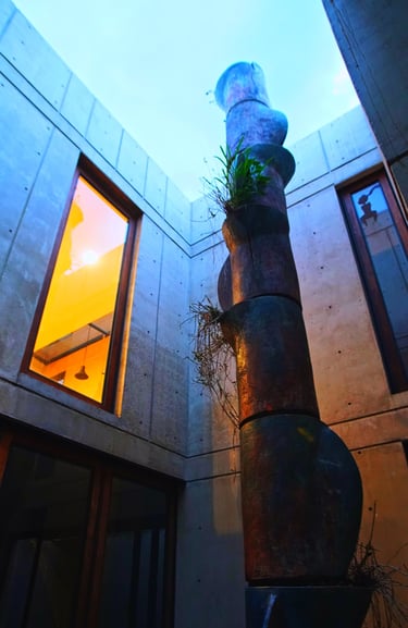 Ubicada al centro del patio principal, la escultura fuente es un elemento decorativo esencial del diseño arquitectónico de CasaBlanca. Su presencia aporta frescura y una sensación de equilibrio que se percibe en cada rincón. El sonido constante del agua se mezcla con la luz natural que se refleja en los muros, reforzando esa identidad de casa vacacional en Oaxaca donde prevalece el lujo y la funcionalidad.