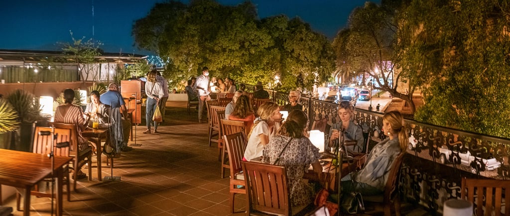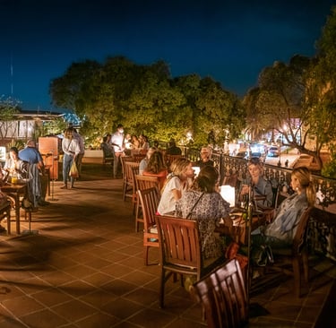 Al atardecer, este lugar se transforma en un espectáculo visual. Los tonos cálidos del sol crepuscular se mezclan armoniosamente con los colores vivos de las decoraciones tradicionales. Las mesas, elegantemente dispuestas, invitan a los visitantes a sentarse y disfrutar de una experiencia gastronómica inigualable, amplificada por la vista impresionante de la ciudad y sus alrededores. La combinación de un entorno estéticamente agradable y un menú excepcional convierte a la terraza en un destino ideal para una cena tranquila o una celebración especial.
