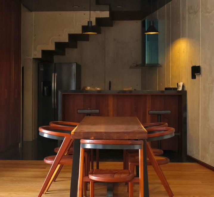Un departamento de tres recámaras que combina amplitud, lujo y funcionalidad. La estancia abierta integra sala, comedor con mesa de madera para seis personas y cocina de mármol negro.