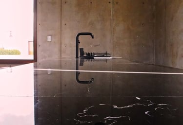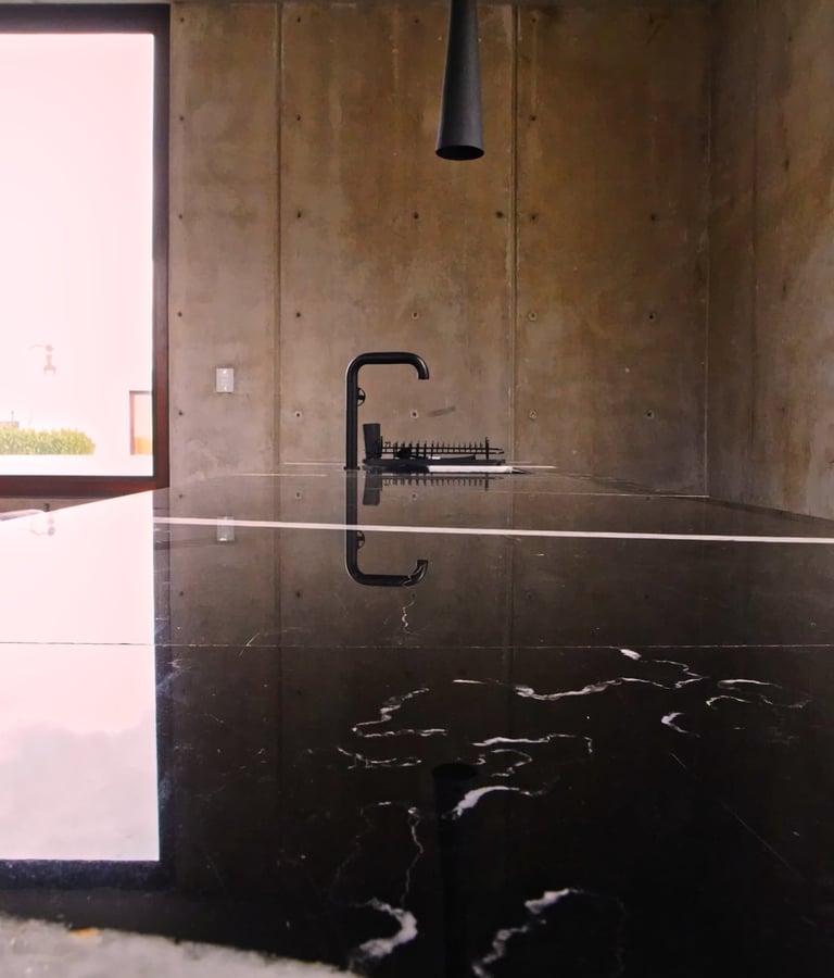 El mármol negro que se usa en cocinas, mesones y detalles en CasaBlanca proviene de vetas compactas cuyas propiedades permiten un pulido profundo, casi espejo. La densidad de este mármol lo hace duradero al uso diario, mientras que su brillo intenso atrapa reflejos, el cielo al amanecer, las luces de la terraza al caer la noche. En las superficies horizontales, su tono oscuro reduce el contraste visual, lo que favorece una atmósfera de recogimiento y enfoque. Cada mancha o veta blanca visible es una huella auténtica, un recordatorio de que el lujo también es lo que permanece firme al paso del tiempo.